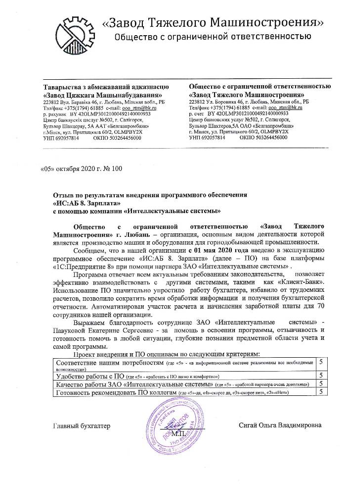 Внедренное решение: Внедрение оригинальной конфигурации "ИС:АБ 8. Зарплата" в Обществе с ограниченной ответственностью " Завод Тяжелого Машиностроения"