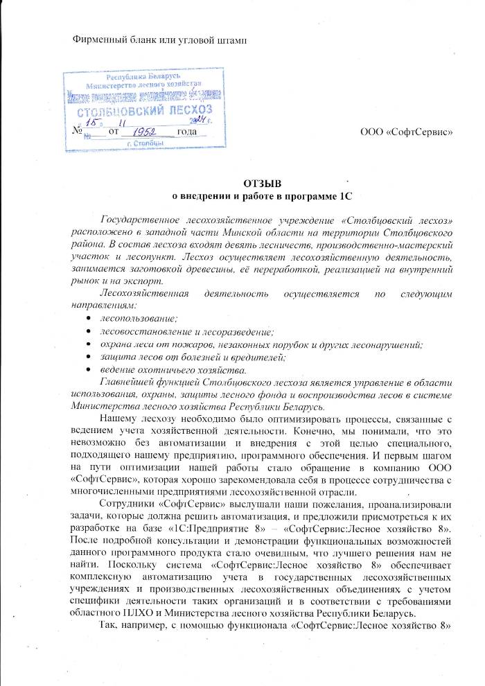 Государственное лесохозяйственное учреждение «Столбцовский лесхоз» расположено в западной части Минской области на территории Столбцовского района. В состав лесхоза входят девять лесничеств, производственно-мастерский участок и лесопункт. Лесхоз осуществляет лесохозяйственную деятельность, занимается заготовкой древесины, её переработкой, реализацией на внутренний рынок и на экспорт. Лесохозяйственная деятельность осуществляется по следующим направлениям: • лесопользование; • лесовосстановление и лесоразведение; • охрана леса от пожаров, незаконных порубок и других лесонарушений; • защита лесов от болезней и вредителей; • ведение охотничьего хозяйства. Главнейшей функцией Столбцовского лесхоза является управление в области использования, охраны, защиты лесного фонда и воспроизводства лесов в системе Министерства лесного хозяйства Республики Беларусь. Нашему лесхозу необходимо было оптимизировать процессы, связанные с ведением учета хозяйственной деятельности. Конечно, мы понимали, что это невозможно без автоматизации и внедрения с этой целью специального, подходящего нашему предприятию, программного обеспечения. И первым шагом на пути оптимизации нашей работы стало обращение в компанию ООО «СофтСервис», которая хорошо зарекомендовала себя в процессе сотрудничества с многочисленными предприятиями лесохозяйственной отрасли. Сотрудники «СофтСервис» выслушали наши пожелания, проанализировали задачи, которые должна решить автоматизация, и предложили присмотреться к их разработке на базе «1С:Предприятие 8» – «СофтСервис:Лесное хозяйство 8». После подробной консультации и демонстрации функциональных возможностей данного программного продукта стало очевидным, что лучшего решения нам не найти. Поскольку система «СофтСервис:Лесное хозяйство 8» обеспечивает комплексную автоматизацию учета в государственных лесохозяйственных учреждениях и производственных лесохозяйственных объединениях с учетом специфики деятельности таких организаций и в соответствии с требованиями областного ПЛХО и Министерства лесного хозяйства Республики Беларусь. Так, например, с помощью функционала «СофтСервис:Лесное хозяйство 8» возможно: • вести учет лесхоза и лесничеств в одной базе данных (лесничества подключаются к системе 1С через интернет); • вести учет лесопродукции в части лесозаготовки (формирование нарядов на лесозаготовку с приходом/без прихода, движение лесопродукции по лесу/по складу/в переработку, приход лесопродукции от сторонних организаций и др.); • производить учет лесопродукции в части лесопереработки (формирование сменных рапортов и сводного табеля по сменным рапортам с расчетом зарплаты, расчет фактической себестоимости лесо- и пилопродукции, в т.ч. в разрезе видов и др.); • вести учет лесорубочных билетов и распределять попенную оплату (лесорубочный билет, лесной билет, ордер на мелкий отпуск и др.); • выгружать данные о количестве отгруженной древесины в ЕГАИС и многое другое. В процессе внедрения выбранного нами программного продукта сотрудники «СофтСервис» выполнили следующий комплекс работ: • Консультации по выбору программного обеспечения и вариантов его сопровождения; • Продажа и установка выбранного программного продукта на компьютеры заказчика; • Планирование этапов работ, со