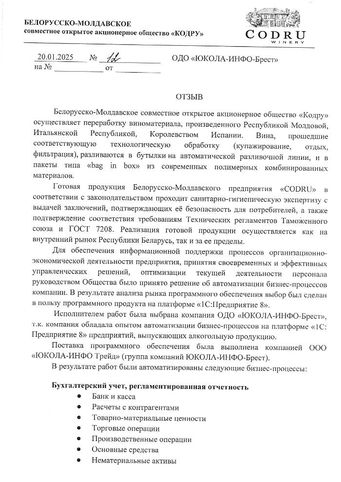 Белорусско-Молдавское совместное открытое акционерное общество «Кодру» осуществляет переработку виноматериала, собранного на виноградниках Молдовы. Вина, прошедшие соответствующую технологическую обработку (купажирование, отдых, фильтрация), разливаются в бутылки на автоматической разливочной линии, и в пакеты типа «bag in box» из современных полимерных комбинированных материалов. Готовая продукция Белорусско-Молдавского предприятия «CODRU» в соответствии с законодательством проходит санитарно-гигиеническую экспертизу с выдачей заключений, подтверждающих её безопасность для потребителей, а также подтверждение соответствия требованиям Технических регламентов Таможенного союза и ГОСТ 7208. Реализация готовой продукции осуществляется как на внутренний рынок Республики Беларусь, так и за рубеж. Для обеспечения информационной поддержки процессов организационно-экономической деятельности предприятия, принятия своевременных и эффективных управленческих решений, оптимизации текущей деятельности персонала руководством БМ СОАО «Кодру» было принято решение об автоматизации бизнес-процессов компании. В результате анализа рынка программного обеспечения выбор был сделан в пользу программного продукта на платформе «1С:Предприятие 8». Исполнителем работ была выбрана компания ОДО «ЮКОЛА-ИНФО-Брест», т.к. компания обладала опытом автоматизации бизнес-процессов на платформе «1С:Предприятие 8» предприятий, выпускающих алкогольную продукцию. Поставка программного обеспечения была выполнена компанией ООО «ЮКОЛА-ИНФО Трейд» (группа компаний ЮКОЛА-ИНФО-Брест). В результате работ были автоматизированы следующие бизнес-процессы: - Бухгалтерский учет, регламентированная отчетность Банк и касса Расчеты с контрагентами Товарно-материальные ценности Торговые операции Производственные операции Основные средства Нематериальные активы Завершение периода Регламентированная отчетность Управление денежными средствами (казначейство) - Склад и логистика Учет ТМЦ в цеховых кладовых Комплектация и разукомплектация ТМЦ Контроль и учет серийных номеров, сроков годности и сертификатов - Продажи (сбыт), сервис, маркетинг Ценообразование, прайс-листы Взаиморасчеты с покупателями Оптовая торговля - Транспорт Учет собственного транспорта - Закупки (снабжение) и управление отношениями с поставщиками Учет прихода ТМЦ Взаиморасчеты с поставщиками - Различная отраслевая специфика Управление данными о составе и структура изделия, рецептура Учет затрат на производство Расчет фактической себестоимости Учет основных средств, расчет амортизации Учет услуг производственного характера Планирование потребности в материалах Диспетчеризация производства на уровне цеха Учет спецодежды и спецоснастки Сертификация качества сырья и продукции - Другое Учет акцизов Учет экспортно-импортных операций Система передана в промышленную эксплуатацию в ноябре 2024 года. Автоматизировано 20 рабочих мест. Проводилось дистанционное обучение пользователей. Сотрудниками ОДО «ЮКОЛА-ИНФО-Брест» осуществляется сопровождение внедренной системы. В результате внедрения были получены следующие результаты: - объединение учета в единой информационной системе и, как следствие, исключение двойного ввода информации по хозяйственным операциям и снижение ошибок пр