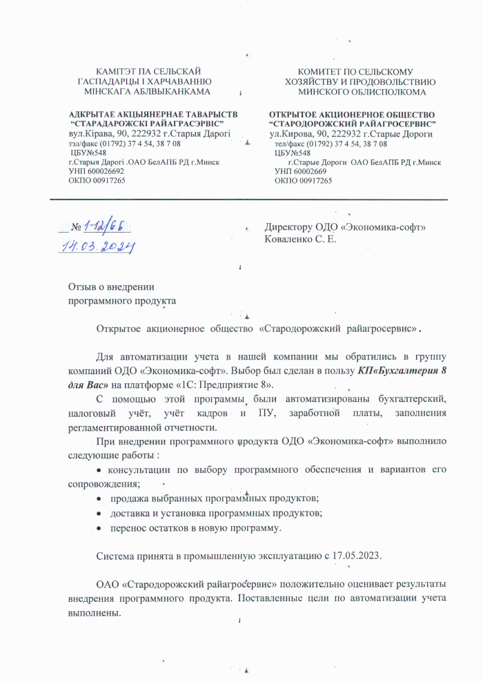 Открытое акционерное общество «Стародорожский райагросервис». Для автоматизации учета в нашей компании мы обратились в группу компаний ОДО «Экономика-софт». Выбор был сделан в пользу КП«Бухгалтерия 8 для Вас» на платформе «1С: Предприятие 8». С помощью этой программы были автоматизированы бухгалтерский, налоговый учёт, учёт кадров и ПУ, заработной платы, заполнения регламентированной отчетности. При внедрении программного продукта ОДО «Экономика-софт» выполнило следующие работы : консультации по выбору программного обеспечения и вариантов его сопровождения; продажа выбранных программных продуктов; доставка и установка программных продуктов; перенос остатков в новую программу. Система принята в промышленную эксплуатацию с 17.05.2023. ОАО «Стародорожский райагросервис» положительно оценивает результаты внедрения программного продукта. Поставленные цели по автоматизации учета выполнены. В настоящее время ОДО «Экономика-софт» осуществляет эксплуатацию и сопровождение программных продуктов в полном объеме.