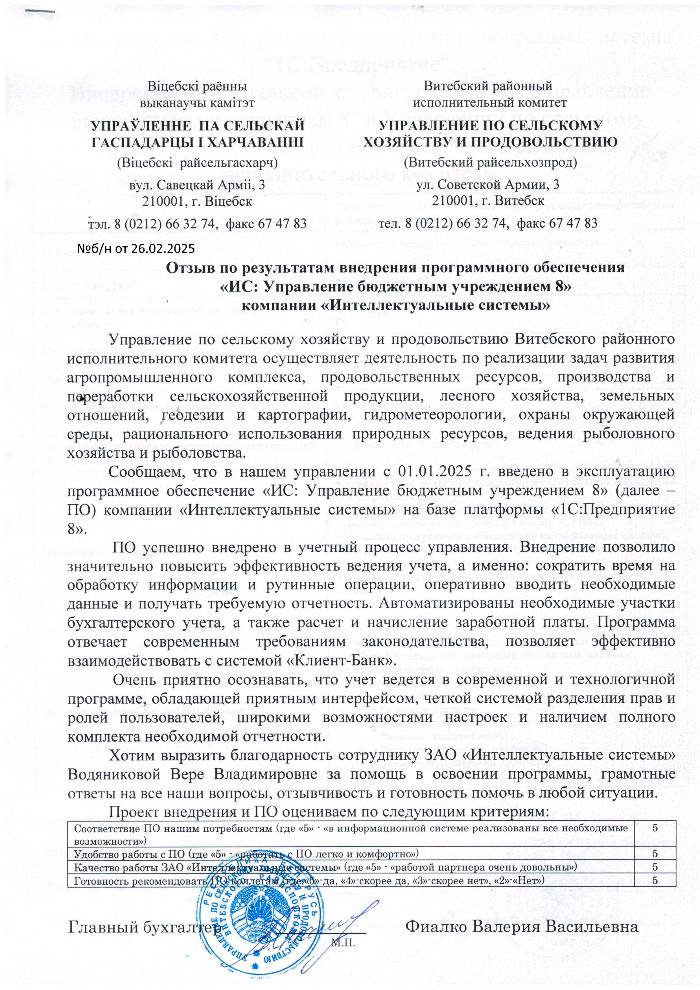 Управление по сельскому хозяйству и продовольствию Витебского районного исполнительного комитета осуществляет деятельность по реализации задач развития агропромышленного комплекса, продовольственных ресурсов, производства и переработки сельскохозяйственной продукции, лесного хозяйства, земельных отношений, геодезии и картографии, гидрометеорологии, охраны окружающей среды, рационального использования природных ресурсов, ведения рыболовного хозяйства и рыболовства. Сообщаем, что в нашем управлении с 01.01.2025 г. введено в эксплуатацию программное обеспечение «ИС: Управление бюджетным учреждением 8» (далее – ПО) компании «Интеллектуальные системы» на базе платформы «1С:Предприятие 8». ПО успешно внедрено в учетный процесс управления. Внедрение позволило значительно повысить эффективность ведения учета, а именно: сократить время на обработку информации и рутинные операции, оперативно вводить необходимые данные и получать требуемую отчетность. Автоматизированы необходимые участки бухгалтерского учета, а также расчет и начисление заработной платы. Программа отвечает современным требованиям законодательства, позволяет эффективно взаимодействовать с системой «Клиент-Банк». Очень приятно осознавать, что учет ведется в современной и технологичной программе, обладающей приятным интерфейсом, четкой системой разделения прав и ролей пользователей, широкими возможностями настроек и наличием полного комплекта необходимой отчетности. Хотим выразить благодарность сотруднику ЗАО «Интеллектуальные системы» Водяниковой Вере Владимировне за помощь в освоении программы, грамотные ответы на все наши вопросы, отзывчивость и готовность помочь в любой ситуации.