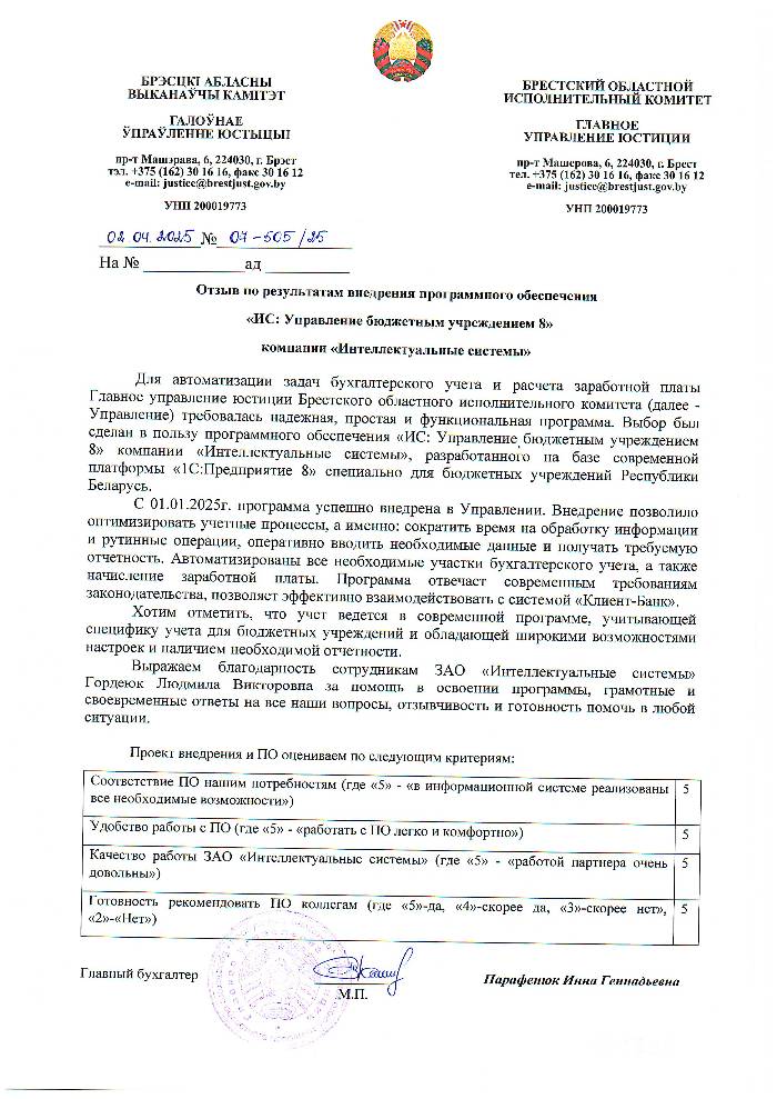 Для автоматизации задач бухгалтерского учета и расчета заработной платы Главное управление юстиции Брестского областного исполнительного комитета (далее - Управление) требовалась надежная, простая и функциональная программа. Выбор был сделан в пользу программного обеспечения «ИС: Управление бюджетным учреждением 8» компании «Интеллектуальные системы», разработанного на базе современной платформы «1С:Предприятие 8» специально для бюджетных учреждений Республики Беларусь. С 01.01.2025г. программа успешно внедрена в Управлении. Внедрение позволило оптимизировать учетные процессы, а именно: сократить время на обработку информации и рутинные операции, оперативно вводить необходимые данные и получать требуемую отчетность. Автоматизированы все необходимые участки бухгалтерского учета, а также начисление заработной платы. Программа отвечает современным требованиям законодательства, позволяет эффективно взаимодействовать с системой «Клиент-Банк». Хотим отметить, что учет ведется в современной программе, учитывающей специфику учета для бюджетных учреждений и обладающей широкими возможностями настроек и наличием необходимой отчетности. Выражаем благодарность сотруднику ЗАО «Интеллектуальные системы» Гордеюк Людмиле Викторовне за помощь в освоении программы, грамотные и своевременные ответы на все наши вопросы, отзывчивость и готовность помочь в любой ситуации.