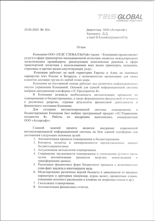 Компания ООО «ТЕЛС ГЛОБАЛ БиУай» (далее – Компания) предоставляет услуги в сфере транспортно-экспедиционной логистики, является международным логистическим провайдером, реализующим комплексные решения в сфере транспортной логистики с использованием всех видов транспорта, складских, страховых и прочих видов сопутствующих услуг. Компания работает на всей территории Европы и Азии, на основных маршрутах в/из России и Беларуси, с возможностью организации для своих клиентов доставки грузов из любой точки мира. Компания на постоянной основе работает над развитием информационных систем управления Компанией. Основой для единой информационной системы выбрана программная платформа «1С:Предприятие 8». В Компании возникла необходимость автоматизации процессов по планированию и бюджетированию, а также формирования финансовой отчетности в различных разрезах, отражая результаты финансовой деятельности и финансового состояния Компании. Для создания автоматизированной системы планирования и бюджетирования Компании был выбран программный продукт «1С:Управление холдингом 8». Работы по внедрению выполнялись специалистами ООО «Астерсофт». Главной задачей проекта является внедрение современной автоматизированной информационной системы на базе единой платформы для достижения следующих основных целей: 1. Автоматизация процесса планирования и бюджетирования. 2. Контроль полноты и своевременности предоставленных данных бюджетодержателями. 3. Актуализация методологии планирования. 4. Сокращение трудоемкости планирования и уменьшение ручного ввода путем автоматизации процессов загрузки, консолидации и трансформации данных. 5. Реализация финансовых форм бюджетного процесса с возможностью план-факт анализа в многомерном виде. 6. Моделирование различных версий бюджета в зависимости от вводных параметров и критериев (например, курсы валют, процентные ставки, изменение штатного расписания и влияние на затратные статьи и др.) 7. Скользящее планирование. 8. Автоматизация финансовых отчетов. Специалисты ООО «Астерсофт» произвели установку программного продукта, настройку системы, индивидуальное обучение персонала, интеграцию программного продукта с действующими информационными системами. Внедрение осуществлялось с применением проектной методологии рекомендованной фирмой 1С. В результате внедрения программного продукта были достигнуты следующие цели и решены задачи: 1. Формирование аналитических, план-факторных и других отчетов по статьям бюджета в различных разрезах (Компания, подразделение, статьи дохода/расхода и др). 2. Контроль исполнения бюджета. 3. Интеграция системы планирования с текущими ИС. 4. Гибкость регламентов планирования. 5. Управление нормативно – справочной информацией в части планирования и бюджетирования. 6. Разграничение доступа к информации, хранящейся в Системе. 7. Консолидация данных с возможностью перехода к исходным взаимосвязанным данным (проваливание) и их расшифровки, анализ показателей, объединенных для консолидации, раскрытие общей статьи по Компании, подразделениям и др. Программный продукт 1С:Управление холдингом 8 введен в промышленную эксплуатацию. Дата ввода в промышленную эксплуатацию август 2024 г. Количество автоматизированных рабочих мест 20. Благодарим ООО «Астерсофт» за профессио