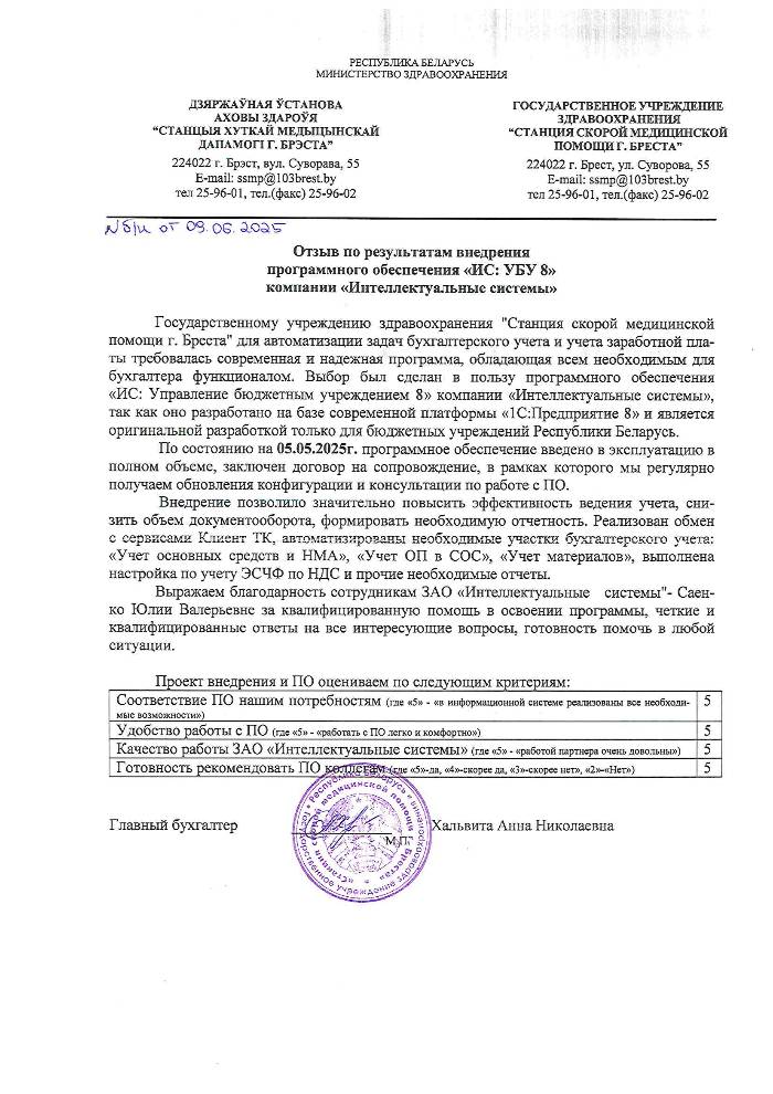 Государственному учреждению здравоохранения "Станция скорой медицинской помощи г.Бреста" для автоматизации задач бухгалтерского учета и учета заработной платы требовалась современная и надежная программа, обладающая всем необходимым для бухгалтера функционалом. Выбор был сделан в пользу программного обеспечения «ИС: Управление бюджетным учреждением 8» компании «Интеллектуальные системы», так как оно разработано на базе современной платформы «1С:Предприятие 8» и является оригинальной разработкой только для бюджетных учреждений Республики Беларусь. По состоянию на 05.05.2025г. программное обеспечение введено в эксплуатацию в полном объеме, заключен договор на сопровождение, в рамках которого мы регулярно получаем обновления конфигурации и консультации по работе с ПО. Внедрение позволило значительно повысить эффективность ведения учета, снизить объем документооборота, формировать необходимую отчетность. Реализован обмен с сервисами Клиент ТК, автоматизированы необходимые участки бухгалтерского учета: «Учет основных средств и НМА», «Учет ОП в СОС», «Учет материалов», выполнена настройка по учету ЭСЧФ по НДС и прочие необходимые отчеты Выражаем благодарность сотрудникам ЗАО «Интеллектуальные системы"- Саенко Юлии Валерьевне за квалифицированную помощь в освоении программы, четкие и квалифицированные ответы на все интересующие вопросы, готовность помочь в любой ситуации.