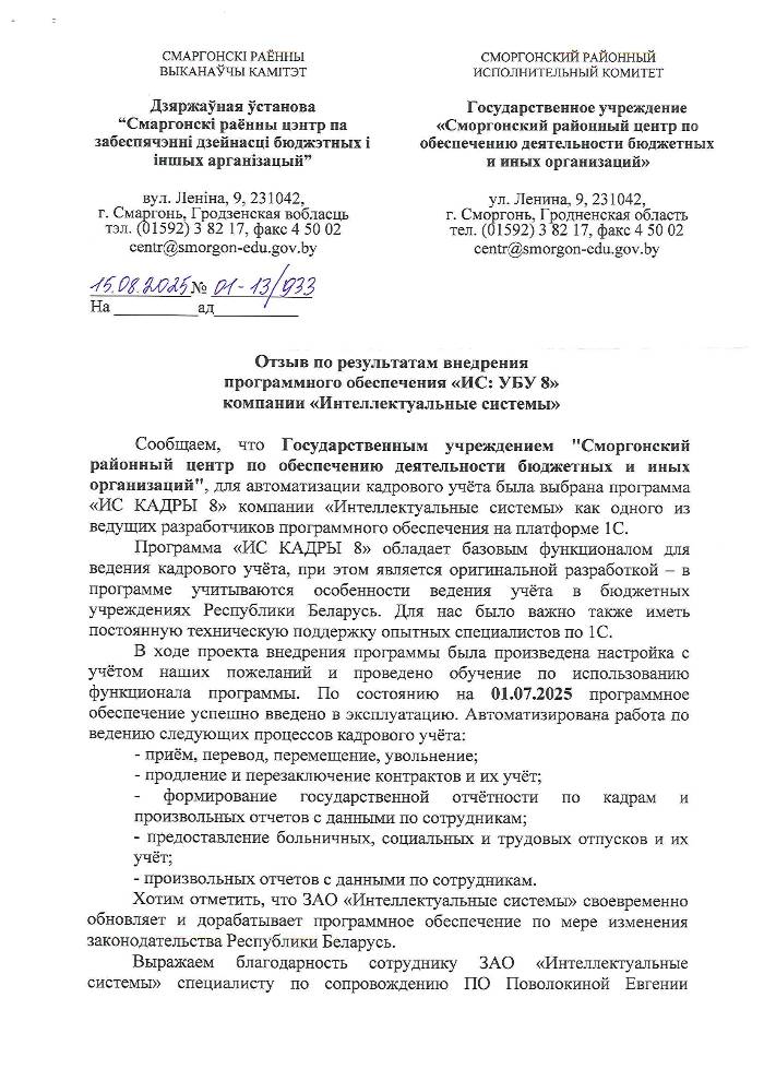 Сообщаем, что Государственным учреждением "Сморгонский районный центр по обеспечению деятельности бюджетных и иных организаций", для автоматизации кадрового учёта была выбрана программа «ИС КАДРЫ 8» компании «Интеллектуальные системы» как одного из ведущих разработчиков программного обеспечения на платформе 1С. Программа «ИС КАДРЫ 8» обладает базовым функционалом для ведения кадрового учёта, при этом является оригинальной разработкой – в программе учитываются особенности ведения учёта в бюджетных учреждениях Республики Беларусь. Для нас было важно также иметь постоянную техническую поддержку опытных специалистов по 1С. В ходе проекта внедрения программы была произведена настройка с учётом наших пожеланий и проведено обучение по использованию функционала программы. По состоянию на 01.07.2025 программное обеспечение успешно введено в эксплуатацию. Автоматизирована работа по ведению следующих процессов кадрового учёта: - приём, перевод, перемещение, увольнение; - продление и перезаключение контрактов и их учёт; - формирование государственной отчётности по кадрам и произвольных отчетов с данными по сотрудникам; - предоставление больничных, социальных и трудовых отпусков и их учёт; - произвольных отчетов с данными по сотрудникам. Хотим отметить, что ЗАО «Интеллектуальные системы» своевременно обновляет и дорабатывает программное обеспечение по мере изменения законодательства Республики Беларусь. Выражаем благодарность сотруднику ЗАО «Интеллектуальные системы» специалисту по сопровождению ПО Поволокиной Евгении Викторовне за помощь в освоении программы, грамотные консультации, отзывчивость и готовность помочь в любой ситуации.