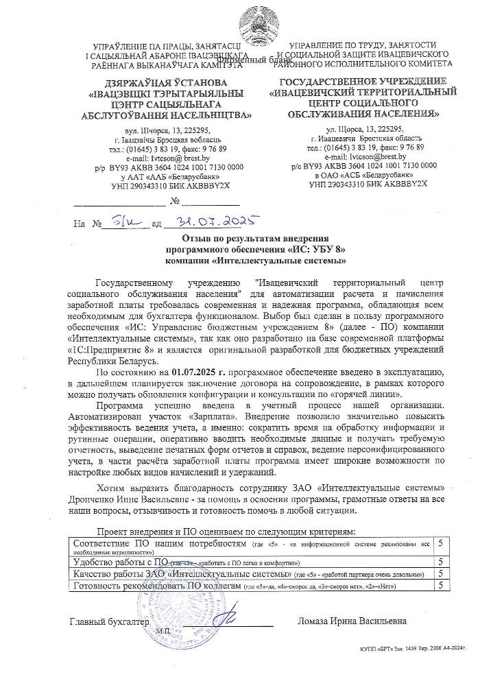 Государственному учреждению "Ивацевичский территориальный центр социального обслуживания населения" для автоматизации расчета и начисления заработной платы требовалась современная и надежная программа, обладающая всем необходимым для бухгалтера функционалом. Выбор был сделан в пользу программного обеспечения «ИС: Управление бюджетным учреждением 8» (далее - ПО) компании «Интеллектуальные системы», так как оно разработано на базе современной платформы «1С:Предприятие 8» и является оригинальной разработкой для бюджетных учреждений Республики Беларусь. По состоянию на 01.07.2025 г. программное обеспечение введено в эксплуатацию, в дальнейшем планируется заключение договора на сопровождение, в рамках которого можно получать обновления конфигурации и консультации по «горячей линии». Программа успешно введена в учетный процесс нашей организации. Автоматизирован участок «Зарплата». Внедрение позволило значительно повысить эффективность ведения учета, а именно: сократить время на обработку информации и рутинные операции, оперативно вводить необходимые данные и получать требуемую отчетность, выведение печатных форм отчетов и справок, ведение персонифицированного учета, в части расчёта заработной платы программа имеет широкие возможности по настройке любых видов начислений и удержаний. Хотим выразить благодарность сотруднику ЗАО «Интеллектуальные системы» Дронченко Инне Васильевне - за помощь в освоении программы, грамотные ответы на все наши вопросы, отзывчивость и готовность помочь в любой ситуации.