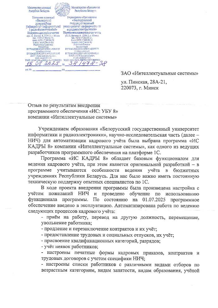 Учреждением образования "Белорусский государственный университет информатики и радиоэлектроники" (Научно-исследовательская часть), для автоматизации кадрового учёта была выбрана программа «ИС КАДРЫ 8» компании «Интеллектуальные системы» как одного из ведущих разработчиков программного обеспечения на платформе 1С. Программа «ИС КАДРЫ 8» обладает базовым функционалом для ведения кадрового учёта, при этом является оригинальной разработкой – в программе учитываются особенности ведения учёта в бюджетных учреждениях Республики Беларусь. Для нас было важно также иметь постоянную техническую поддержку опытных специалистов по 1С. В ходе проекта внедрения программы была произведена настройка с учётом наших пожеланий и проведено обучение по использованию функционала программы. По состоянию на 01.07.2025 программное обеспечение введено в эксплуатацию. Автоматизирована работа по ведению следующих процессов кадрового учёта: - приём на работу, перевод на другую должность, перемещение, увольнение работника; - продление и перезаключение контрактов и их учёт; - предоставление трудовых и социальных отпусков, их учёт; - присвоение квалификационных категорий, разрядов; - ведение штатного расписания; - учёт неявок работников; - настроены печатные формы кадровых приказов, контрактов и трудовых договоров с учетом специфики нашей организации; - настроены списки работников с различными видами отборов по возрастным категориям, видам занятости, видам образования, учёной степени, учёного звания и другой информации, которая содержится в программе; Хотим отметить, что ЗАО «Интеллектуальные системы» своевременно обновляет и дорабатывает программное обеспечение по мере изменения законодательства Республики Беларусь. Выражаем благодарность сотруднику ЗАО «Интеллектуальные системы» Серебряковой Наталье Николаевне, специалисту по сопровождению ПО за обучение работе в программе по модулю «Кадры», квалифицированную и своевременную помощь в решении вопросов, связанных с работой в программе.