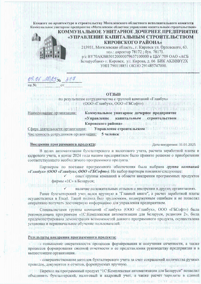 ОТЗЫВ по результатам сотрудничества с группой компаний «Главбух» (ООО «Главбух», ООО «ГБСофт») Наименование организации: Коммунальное унитарное дочернее предприятие «Управление капитальным строительством Кировского района» Сфера деятельности организации: Управление строительском Численность сотрудников организации: 5 человек Внедрение программного продукта: Дата внедрения 31.01.2025 В целях автоматизации бухгалтерского и налогового учета, расчета заработной платы и кадрового учета, в конце 2024 года нашим предприятием было принято решение о приобретении соответствующего необходимого программного продукта. Партнером по поставке программного обеспечения была выбрана группа компаний «Главбух» (ООО «Главбух», ООО «ГБСофт»). На выбор партнера повлияло следующее: - опыт группы компаний в области внедрения программных продуктов фирмы «1С» в Беларуси; - наличие положительных отзывов о внедрении в других организациях. Ранее бухгалтерский учет велся вручную в "Главной книге", а расчет заработной платы осуществлялся в Excel. Такой подход был трудоемким, подверженным ошибкам и не позволял оперативно получать достоверную информацию для управления предприятием. Специалистами группы компаний «Главбух» (ООО «Главбух», ООО «ГБСофт») была рекомендована программам «1С:Комплексная автоматизация для Беларуси, редакция 2», была продемонстрирована демонстрация возможностей данного программного продукта, осуществлена установка и первоначальное обучение пользователей. Результаты внедрения программного продукта: - повышение оперативности процессов формирования и получения отчетности, а также процессов формирования сводной отчетности и ее представления руководству предприятия и в вышестоящие организации. - совершенствование методов бухгалтерского учета за счет сокращений количества ручных проводок, документов и отчетов, формируемых вручную. Переход на программный продукт “1С:Комплексная автоматизация для Беларуси” позволил объединить бухгалтерский, налоговый и кадровый учет, а также расчет зарплаты в единой системе, полностью адаптированной под белорусское законодательство и требования регламентированной отчетности. Количество автоматизированных рабочих мест – 1. Оценка программного продукта и сотрудничества. Рекомендации: - Оценка соответствия программного обеспечения потребностям предприятия 5 - Оценка удобства работы с программой 5 - Оценка качества работы партнера 5 * оценки внедрения по 5-бальной шкале (где «5» - наивысшее значение) Рекомендовали бы мы своим коллегам использовать данное программное решение для автоматизации: Да + Скорее да Скорее нет Нет Мы рекомендуем другим компаниям сотрудничать с группой компаний «Главбух» (ООО «Главбух», ООО «ГБСофт») в целях автоматизации хозяйственной деятельности. Должность (подпись) МП (Инициалы, Фамилия)