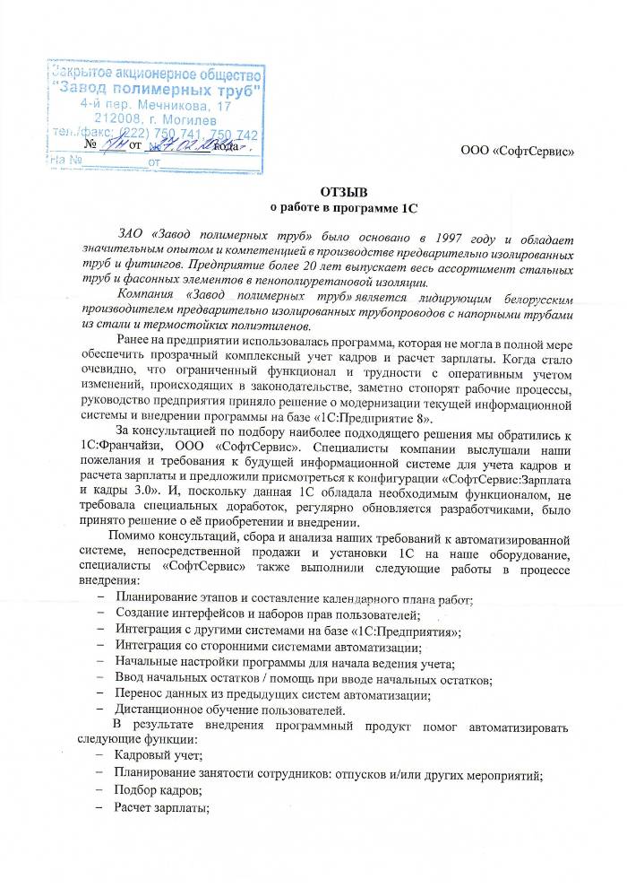 ЗАО «Завод полимерных труб» было основано в 1997 году и обладает значительным опытом и компетенцией в производстве предварительно изолированных труб и фитингов. Предприятие более 20 лет выпускает весь ассортимент стальных труб и фасонных элементов в пенополиуретановой изоляции. Компания «Завод полимерных труб» является лидирующим белорусским производителем предварительно изолированных трубопроводов с напорными трубами из стали и термостойких полиэтиленов. Ранее на предприятии использовалась программа, которая не могла в полной мере обеспечить прозрачный комплексный учет кадров и расчет зарплаты. Когда стало очевидно, что ограниченный функционал и трудности с оперативным учетом изменений, происходящих в законодательстве, заметно стопорят рабочие процессы, руководство предприятия приняло решение о модернизации текущей информационной системы и внедрении программы на базе «1С:Предприятие 8». За консультацией по подбору наиболее подходящего решения мы обратились к 1С:Франчайзи, ООО «СофтСервис». Специалисты компании выслушали наши пожелания и требования к будущей информационной системе для учета кадров и расчета зарплаты и предложили присмотреться к конфигурации «СофтСервис:Зарплата и кадры 3.0». И, поскольку данная 1С обладала необходимым функционалом, не требовала специальных доработок, регулярно обновляется разработчиками, было принято решение о её приобретении и внедрении. Помимо консультаций, сбора и анализа наших требований к автоматизированной системе, непосредственной продажи и установки 1С на наше оборудование, специалисты «СофтСервис» также выполнили следующие работы в процессе внедрения: - Планирование этапов и составление календарного плана работ; - Создание интерфейсов и наборов прав пользователей; - Интеграция с другими системами на базе «1С:Предприятия»; - Интеграция со сторонними системами автоматизации; - Начальные настройки программы для начала ведения учета; - Ввод начальных остатков / помощь при вводе начальных остатков; - Перенос данных из предыдущих систем автоматизации; - Дистанционное обучение пользователей. В результате внедрения программный продукт помог автоматизировать следующие функции: - Кадровый учет; - Планирование занятости сотрудников: отпусков и/или других мероприятий; - Подбор кадров; - Расчет зарплаты; - Регламентированная отчетность; - Учет рабочего времени. Программа «СофтСервис:Зарплата и кадры 3.0» помогла закрыть основные потребности нашего предприятия по части учета кадров и расчета зарплаты и других начислений. Ускорен процесс обработки первичных документов, ручная и бумажная работа, как и вероятность ошибок, сведены к минимуму. Процесс формирования и сдачи отчетности стал более оперативным и прозрачным. В результате внедрения было автоматизировано 3 рабочих места. Дата начала промышленной эксплуатации: июль 2024 г. При необходимости специалисты «СофтСервис» осуществляют консультирование по методическим и техническим вопросам работы в 1С, а также регулярно обновляют программу, обеспечивая ее соответствие текущему законодательству. Благодарим компанию «СофтСервис» за квалифицированную работу и надеемся на дальнейшее сотрудничество!