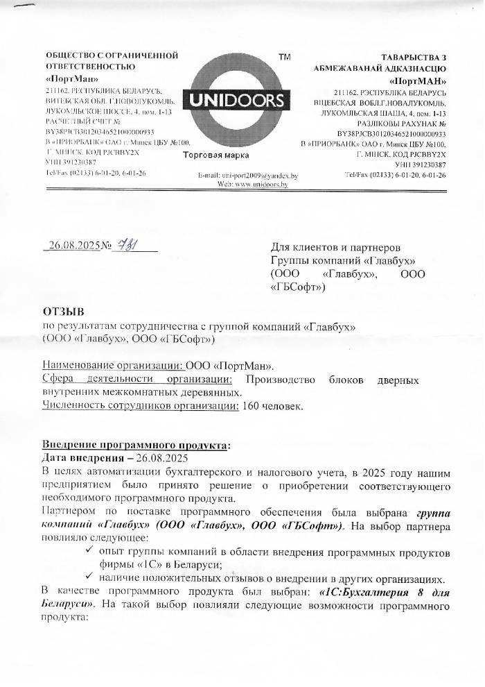 ОТЗЫВ по результатам сотрудничества с группой компаний «Главбух» (ООО «Главбух», ООО «ГБСофт») Наименование организации: ООО «ПортМан». Сфера деятельности организации: Производство блоков дверных внутренних межкомнатных деревянных. Численность сотрудников организации: 160 человек. Внедрение программного продукта: Дата внедрения – 26.08.2025 В целях автоматизации бухгалтерского и налогового учета, в 2025 году нашим предприятием было принято решение о приобретении соответствующего необходимого программного продукта. Партнером по поставке программного обеспечения была выбрана группа компаний «Главбух» (ООО «Главбух», ООО «ГБСофт»). На выбор партнера повлияло следующее: опыт группы компаний в области внедрения программных продуктов фирмы «1С» в Беларуси; наличие положительных отзывов о внедрении в других организациях. В качестве программного продукта был выбран: «1С:Бухгалтерия 8 для Беларуси». На такой выбор повлияли следующие возможности программного продукта: ведение банковских и кассовых операций, налогового учета; учет хозяйственных операций, связанных с производственной деятельностью организации, основных средств и нематериальных активов; формирование регламентированной отчетности и т.д. Специалистами группы компаний «Главбух» (ООО «Главбух», ООО «ГБСофт») была осуществлена: консультация по выбору программного продукта и демонстрация его возможностей; продажа выбранного программного продукта; установка программного продукта; первоначальное обучение пользователей. Программный продукт внедрен без существенных изменений. Результаты внедрения программного продукта: В настоящий момент приобретенный программный продукт используется на 10 (десяти) рабочих местах. Внедрение программного продукта «1С:Бухгалтерия 8 для Беларуси» позволило минимизировать риски ошибочных данных при осуществлении расчетов, увеличить скорость операций по бухгалтерскому и налоговому учету. Оценка программного продукта и сотрудничества: Оценка соответствия программного обеспечения потребностям предприятия 5 Оценка удобства работы с программой 5 Оценка качества работы партнера 5 * оценки внедрения по 5-бальной шкале (где «5» - наивысшее значение) Рекомендации: Рекомендовали бы мы своим коллегам использовать данное программное решение для автоматизации: Да Скорее да Скорее нет Нет Мы рекомендуем другим компаниям сотрудничать с группой компаний «Главбух» (ООО «Главбух», ООО «ГБСофт») в целях автоматизации хозяйственной деятельности. Директор С. В. Шетько МП