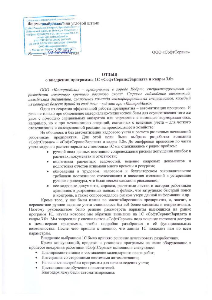 ООО «КантриМилк» – предприятие в городе Кобрин, специализирующееся на разведении молочного крупного рогатого скота. Строгое соблюдение технологий, незыблемая дисциплина, слаженная команда квалифицированных специалистов, каждый из которых болеет душой за своё дело – всё это про «КантриМилк». Один из секретов эффективной работы предприятия – автоматизация процессов. И речь не только про обновление материально-технической базы для осуществления того же удоя с помощью специальных аппаратов или кормления с помощью кормораздатчика, например, но и про механизацию операций, связанных с ведением учета – для четкого отслеживания и своевременной реакции на происходящее в хозяйстве. Не обошлось и без автоматизации кадрового учета и расчета различных начислений работникам предприятия. Для этой цели была выбрана разработка компании «СофтСервис» – «СофтСервис:Зарплата и кадры 3.0». До оцифровки процессов по части учета кадров и расчета зарплаты с помощью 1С мы сталкивались с рядом проблем: • ручной ввод данных постоянно сопровождался риском допущения ошибок в расчетах, документах и отчетности; • подготовка расчетных ведомостей, ведение кадровых документов и подготовка отчетов отнимали много времени и ресурсов; • обновления в трудовом, налоговом и бухгалтерском законодательстве требовали постоянного отслеживания и внесения изменений в устаревшие ручные процедуры, что было весьма сложно и рискованно; • все кадровые документы, справки, расчетные листки и истории работников хранились в разрозненных папках и файлах, что затрудняло быстрый поиск и контроль, а также сопровождалось риском утери данной информации и др. Кроме того, у нас были планы по масштабированию предприятия, а, значит, в перспективе ручное ведение учета становилось бы всё более сложным и непрактичным. Поэтому руководством было решено рассмотреть варианты имеющихся на рынке программ 1С, изучая которые мы обратили внимание на 1С «СофтСервис:Зарплата и кадры 3.0». Мы запросили у специалистов «СофтСервис» подключение тестового доступа к демо-версии программы, чтобы подробно разобраться в её функциональных возможностях. После чего пришли к мнению, что данная 1С подходит нам по всем параметрам. Внедрение выбранной 1С было принято решение делегировать разработчику. Кроме консультаций, продажи и установки программы на наше оборудование в процессе внедрения работники «СофтСервис» выполнили следующее: • Планирование этапов и составление календарного плана работ; • Интеграция со сторонними системами автоматизации; • Начальные настройки программы для начала ведения учета; • Дистанционное обучение пользователей. Благодаря чему были автоматизированы: • Кадровый учет; • Расчет зарплаты; • Учет рабочего времени; • Регламентированная отчетность. И, в результате внедрения на нашем предприятии системы «СофтСервис:Зарплата и кадры 3.0»: • Повысилась точность расчетов. Все вычисления выполняются самой 1С по заданным параметрам без человеческого фактора, что исключает ошибки при начислении зарплаты, налогов и взносов. • Экономия времени. Ручной расчет зарплаты и подготовка отчетов занимали много времени. 1С автоматизировала этот процесс и освободила сотрудников для решения других задач. • Упростилось ведение кадрового делопроизводства. Все документы, включая 