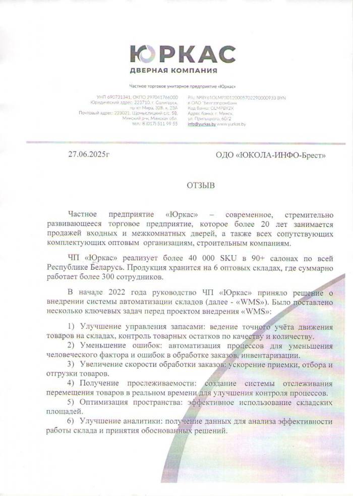Частное предприятие «Юркас» – современное, стремительно развивающееся торговое предприятие, которое более 20 лет занимается продажей входных и межкомнатных дверей, а также всех сопутствующих комплектующих оптовым и розничным торгующим организациям, строительным компаниям. ЧП «Юркас» реализует более 40 000 SKU в 90+ салонах по всей Республике Беларусь. Продукция хранится на 6 оптовых складах, где суммарно работает более 300 сотрудников. В начале 2022 года руководство ЧП «Юркас» приняло решение о внедрении системы автоматизации складов (далее - «WMS»). Было поставлено несколько ключевых задач перед проектом внедрения «WMS»: 1. Улучшение управления запасами: ведение точного учёта движения товаров на складах, контроль товарных остатков по качеству и количеству. 2. Уменьшение ошибок: автоматизация процессов для уменьшения человеческого фактора и ошибок в обработке заказов, инвентаризации. 3. Увеличение скорости обработки заказов: ускорение приемки, отбора и отгрузки товаров. 4. Получение прослеживаемости: создание системы отслеживания перемещения товаров в реальном времени для улучшения контроля процессов. 5. Оптимизация пространства: эффективное использование складских площадей. 6. Улучшение аналитики: получение данных для анализа эффективности работы склада и принятия обоснованных решений. ЧП «Юркас» было знакомо с программными продуктами 1С, поэтому работы по автоматизации было решено выполнить на базе программного продукта «1С:Предприятие 8. WMS Логистика. Управление складом». В качестве исполнителя работ была выбрана компания ОДО «ЮКОЛА-ИНФО-Брест», которая имела опыт автоматизации бизнес-процессов управления складами на платформе «1С:Предприятие 8» на крупных предприятиях. Поставку программного обеспечения для автоматизации осуществляла компания ООО «ЮКОЛА-ИНФО Трейд» (группа компаний ЮКОЛА-ИНФО-Брест). В результате внедрения программного продукта «1С:Предприятие 8. WMS Логистика. Управление складом» на объекте г. Минска был автоматизирован процесс управления складом. В последующем на складах г.Бреста, г.Гомеля, г.Гродно было выполнено тиражирование внедренного решения. Автоматизирована следующая функциональность: Задание топологии складского комплекса Приемка товара на склад (от поставщика и с производства) по распоряжениям (ожидаемой приемке) и без Размещение товара Отбор и отгрузка товара Перемещение Инвентаризация, оприходование и списание товаров по результатам инвентаризации Комплектация Рабочее место контроля отгрузки Контроль работы склада: мониторы руководителя склада и диспетчеров приемки и отгрузки Расчет вместимости ячейки по количеству номенклатуры Размещение паллеты на другую паллету Учет товаров с неуникальными штрихкодами Работа с качеством Настройка различных стратегий отбора и размещения в зависимости от зоны и типа товара (паллетами, поштучно) Настройка сценарием автоматического формирования задач на перемещение контейнеров. Механизм проверки правильности отбора и размещения через проверочное число Блокировка задачи, в случае невозможности размещения в спланированную ячейку, планирование следующей задачи Формирование задач на размещение только после выполнения полной приемки по распоряжению Фиксация расхождений при приемке, передача информации сотруднику, ответственному за оформ