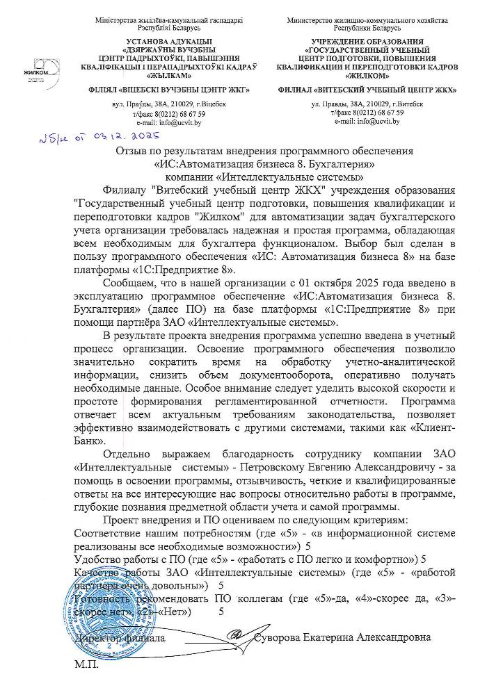 Филиалу "Витебский учебный центр ЖКХ" учреждения образования "Государственный учебный центр подготовки, повышения квалификации и переподготовки кадров "Жилком" для автоматизации задач бухгалтерского учета организации требовалась надежная и простая программа, обладающая всем необходимым для бухгалтера функционалом. Выбор был сделан в пользу программного обеспечения «ИС: Автоматизация бизнеса 8» на базе платформы «1С:Предприятие 8». Сообщаем, что в нашей организации с 01 октября 2025 года введено в эксплуатацию программное обеспечение «ИС:Автоматизация бизнеса 8. Бухгалтерия» (далее ПО) на базе платформы «1С:Предприятие 8» при помощи партнёра ЗАО «Интеллектуальные системы». В результате проекта внедрения программа успешно введена в учетный процесс организации. Освоение программного обеспечения позволило значительно сократить время на обработку учетно-аналитической информации, снизить объем документооборота, оперативно получать необходимые данные. Особое внимание следует уделить высокой скорости и простоте формирования регламентированной отчетности. Программа отвечает всем актуальным требованиям законодательства, позволяет эффективно взаимодействовать с другими системами, такими как «Клиент-Банк». Отдельно выражаем благодарность сотруднику компании ЗАО «Интеллектуальные системы» - Петровскому Евгению Александровичу - за помощь в освоении программы, отзывчивость и четкие и квалифицированные ответы на все интересующие нас вопросы относительно работы в программе, глубокие познания предметной области учета и самой программы.