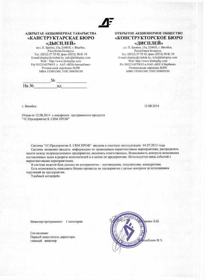 Система “1С:Предприятие 8. CRM ПРОФ” введена в опытную эксплуатацию 04.07.2013 года. Система позволяет вводить информацию по проводимым маркетинговым мероприятиям, распределять задачи между подразделениями предприятия, назначать ответственных. Возможность контроля исполнения поставленных задач в разрезе исполнителей и в целом по предприятию. Используется связь событий с маркетинговыми мероприятиями. В системе ведется база данных по контрагентам - поставщикам, покупателям, конкурентам. Есть возможность описывать бизнес-процессы на предприятии с целью контроля за исполнением поручений на предприятии. Удобный интерфейс.