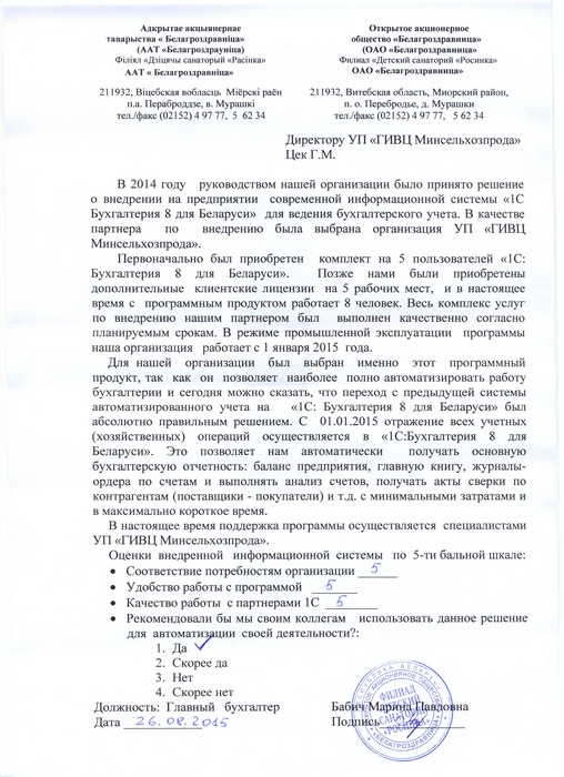 В 2014 году руководством нашей организации было принято решение о внедрении на предприятии современной информационной системы «1С Бухгалтерия 8 для Беларуси» для ведения бухгалтерского учета. В качестве партнера по внедрению была выбрана организация УП «ГИВЦ Минсельхозпрода». Первоначально был приобретен комплект на 5 пользователей «1С: Бухгалтерия 8 для Беларуси». Позже нами были приобретены дополнительные клиентские лицензии на 5 рабочих мест, и в настоящее время с программным продуктом работает 8 человек. Весь комплекс услуг по внедрению нашим партнером был выполнен качественно согласно планируемым срокам. В режиме промышленной эксплуатации программы наша организация работает с 1 января 2015 года. Для нашей организации был выбран именно этот программный продукт, так как он позволяет наиболее полно автоматизировать работу бухгалтерии и сегодня можно сказать, что переход с предыдущей системы автоматизированного учета на «1С: Бухгалтерия 8 для Беларуси» был абсолютно правильным решением. С 01.01.2015 отражение всех учетных (хозяйственных) операций осуществляется в «1С: Бухгалтерия 8 для Беларуси». Это позволяет нам автоматически получать основную бухгалтерскую отчетность: баланс предприятия, главную книгу, журналы-ордера по счетам и выполнять анализ счетов, получать акты сверки по контрагентам (поставщики - покупатели) и т.д. с минимальными затратами и в максимально короткое время. В настоящее время поддержка программы осуществляется специалистами УП «ГИВЦ Минсельхозпрода». Оценки внедренной информационной системы по 5-ти бальной шкале: • Соответствие потребностям организации __5____ • Удобство работы с программой ___5____ • Качество работы с партнерами 1С ___5_____ • Рекомендовали бы мы своим коллегам использовать данное решение для автоматизации своей деятельности?: 1. Да + 2. Скорее да 3. Нет 4. Скорее нет