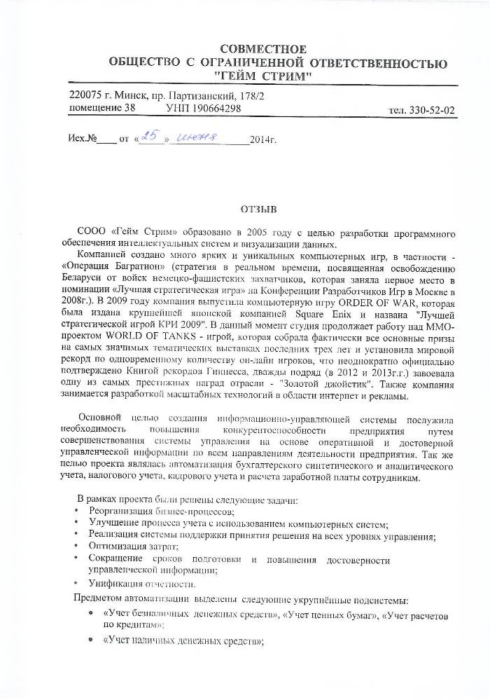 СООО «Гейм Стрим» образовано в 2005 году с целью разработки программного обеспечения интеллектуальных систем и визуализации данных. Компанией создано много ярких и уникальных компьютерных игр, в частности - «Операция Багратион» (стратегия в реальном времени, посвященная освобождению Беларуси от войск немецко-фашистских захватчиков, которая заняла первое место в номинации «Лучшая стратегическая игра» на Конференции Разработчиков Игр в Москве в 2008г.). В 2009 году компания выпустила компьютерную игру ORDER OF WAR, которая была издана крупнейшей японской компанией Square Enix и названа "Лучшей стратегической игрой КРИ 2009". В данный момент студия продолжает работу над ММО- проектом WORLD OF TANKS - игрой, которая собрала фактически все основные призы на самых значимых тематических выставках последних трех лет и установила мировой рекорд по одновременному количеству он-лайн игроков, что неоднократно официально подтверждено Книгой рекордов Гиннесса, дважды подряд (в 2012 и 201Зг.г.) завоевала одну из самых престижных наград отрасли - "Золотой джойстик". Также компания занимается разработкой масштабных технологий в области интернет и рекламы. Основной целью создания информационно-управляющей системы послужила необходимость повышения конкурентоспособности предприятия путем совершенствования системы управления па основе оперативной и достоверной управленческой информации по всем направлениям деятельности предприятия. Так же целью проекта являлась автоматизация бухгалтерского синтетического и аналитического учета, налогового учета, кадрового учета и расчета заработной платы сотрудникам. В рамках проекта были решены следующие задачи: Реорганизация бизнес-процессов; • Улучшение процесса учета с использованием компьютерных систем; • Реализация системы поддержки принятия решения на всех уровнях управления; • Оптимизация затрат; • Сокращение сроков подготовки и повышения достоверности управленческой информации; Унификация отчетности. Предметом автоматизации выделены следующие укрупнённые подсистемы: «Учет безналичных денежных средств», «Учет ценных бумаг», «Учет расчетов по кредитам»; «Учет наличных денежных средств»; «Расчеты с подотчетными лицами»; «Учет ОС», Учет лизинговых операций», «Учет вложений во внеоборотные активы»; «Учет НМ А»; «Учет выполненных работ и оказанных услуг», «Учет аренды»; «Учег ТМЦ», «Учет специальных инструментов и приспособлений, специальной одежды и обуви». « Учет давальческого сырья, учет материалов, переданных в переработку»; «Учет бланков строгой отчетности»; «Учет товаров». «Учет товаров в рознице и общепите»; «Учет расходов будущих периодов, операционных и внереализационных доходов и расходов»; «Учет путевых листов»; « «Учет расчетов с контрагентами»; «Учет налогов. Книга покупок. Учет затрат на производство и калькуляция себестоимости»; «Бухгалтерская отчетность» Кадровый учет; Расчет заработной платы; В качестве платформы для автоматизации была выбраны: «1С:Бухгалтсрия 8 для Беларуси» и оригинальная конфигурация «Моя Бухгалтерия 8», и «1С:Зарплата и Управление персоналом 8 дли Беларуси» и оригинальная конфигурация «Моя Зарплата 8», разработанные ООО «Хыомен систем», которые были доработаны в соответствии с согласованном сторонами документе «Техническое Задание». Среднесписочная численно