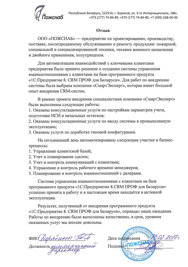 ООО «ПОЖСНАБ» — предприятие по проектированию, производству, поставке, послепродажному обслуживанию и ремонту продукции: пожарной, специальной и специализированной техники, техники военного назначения и двойного применения, полуприцепов. Для автоматизации взаимодействий с ключевыми клиентами предприятия было принято решение о создании системы управления взаимоотношениями с клиентами на базе программного продукта «1С:Предприятие 8. CRM ПРОФ для Беларуси». Для работ по внедрению системы была выбрана компания «СмартЭксперт», которая имеет большой опыт внедрения CRM-систем. В рамках проекта внедрения специалистами компании «СмартЭксперт» были выполнены следующие работы: 1. Оказаны консультационные услуги по настройкам параметров учета, подготовке НСИ и начальных остатков; 2. Оказаны консультационные услуги по вводу системы в промышленную эксплуатацию; 3. Оказаны услуги по доработке типовой конфигурации. На сегодняшний день автоматизированы следующие участки и бизнес-процессы: 1. Управление клиентской базой; 2. Учет и планирование сделок; 3. Учет и контроль коммуникаций с клиентами; 4. Управление и контроль рабочего времени менеджеров; 5. Планирование и контроль взаимоотношений с дилерами. Система управления взаимоотношениями с клиентами на базе программного продукта «1С:Предприятие 8.CRM ПРОФ для Беларуси» успешно принята в работу и в настоящее время находится в активной эксплуатации. Результат, полученный от внедрения программного продукта «1С:Предприятие 8. CRM ПРОФ для Беларуси», оправдал наши ожидания. Работы по внедрению были выполнены качественно, в срок, уровнем оказанных услуг мы вполне довольны.