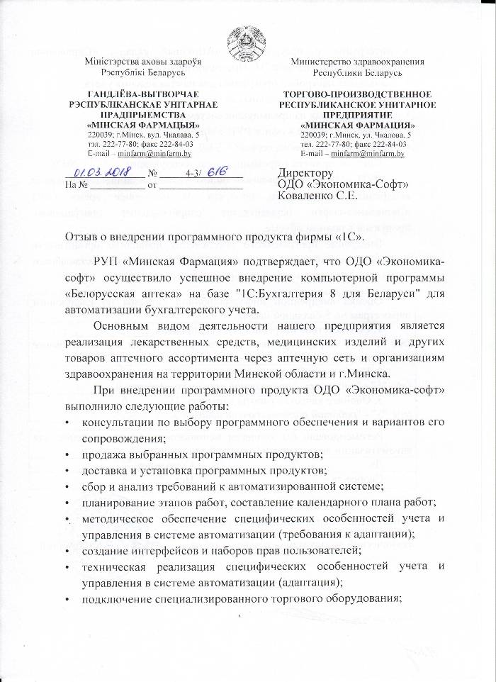 РУП «Минская Фармация» подтверждает, что ОДО «Экономика-софт» осуществило успешное внедрение компьютерной программы «Белорусская аптека» на базе "1С:Бухгалтерия 8 для Беларуси" для автоматизации бухгалтерского учета. Основным видом деятельности нашего предприятия является реализация лекарственных средств, изделий медицинского назначения и других товаров аптечного ассортимента через аптечную сеть и организациям здравоохранения на территории Минской области и г.Минска. При внедрении программного продукта ОДО «Экономика-софт» выполнило следующие работы: • консультации по выбору программного обеспечения и вариантов его сопровождения; • продажа выбранных программных продуктов; • доставка и установка программных продуктов; • сбор и анализ требований к автоматизированной системе; • планирование этапов работ, составление календарного плана работ; • методическое обеспечение специфических особенностей учета и управления в системе автоматизации (требования к адаптации); • создание интерфейсов и наборов прав пользователей; • техническая реализация специфических особенностей учета и управления в системе автоматизации (адаптация); • подключение специализированного торгового оборудования; • интеграция с программами «Аптечный склад», «Справочная аптечной сети» на базе "1С:Предприятия"; • начальные настройки программы для начала ведения учета; • помощь при вводе начальных остатков; • перенос данных из предыдущих систем автоматизации; • обучение в группе в офисе РУП «Минская Фармация»; • установка и настройка сервера СУБД. Система принята в промышленную эксплуатацию с 21.11.2017г. РУП «Минская Фармация» положительно оценивает результаты внедрения программного продукта. В настоящее время ОДО «Экономика-софт» осуществляет сопровождение программных продуктов в полном объеме. Внедрение программного обеспечения позволило организовать полный товарный учет в аптеке №13 д.Грозово с предоставлением необходимой аналитической отчетности.