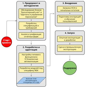 Специалисты ГК «Главбух» применили поэтапную методологию внедрения, начиная с предпроектного обследования ключевых блоков («Бухгалтерский и налоговый учет» и «Учет заработной платы и кадров»). Проект был реализован в несколько этапов, что обеспечило плавный переход предприятия к работе в новой системе и позволило учесть все особенности производственной специфики ЖБК.