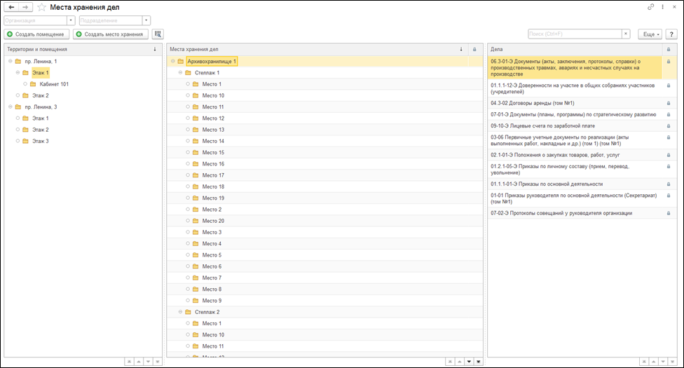 Справочник «Места хранения дел» является иерархическим с неограниченным количеством уровней. Типичная структура:
