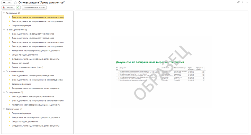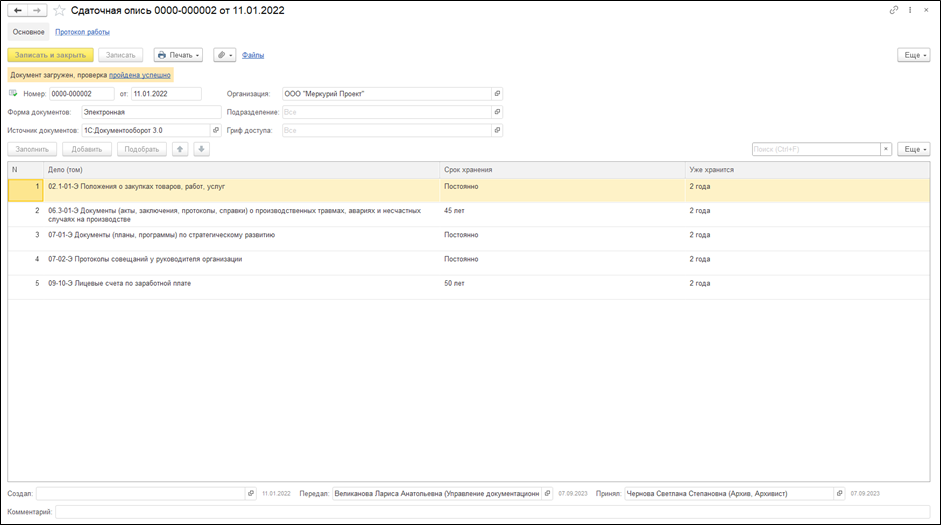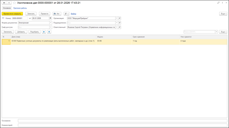 Когда срок хранения документов истек, система позволяет оформить их уничтожение: