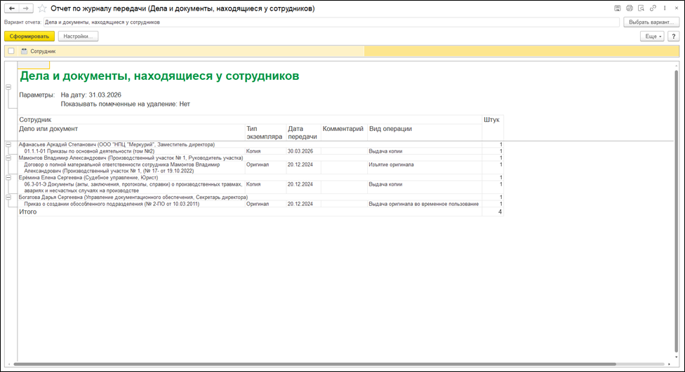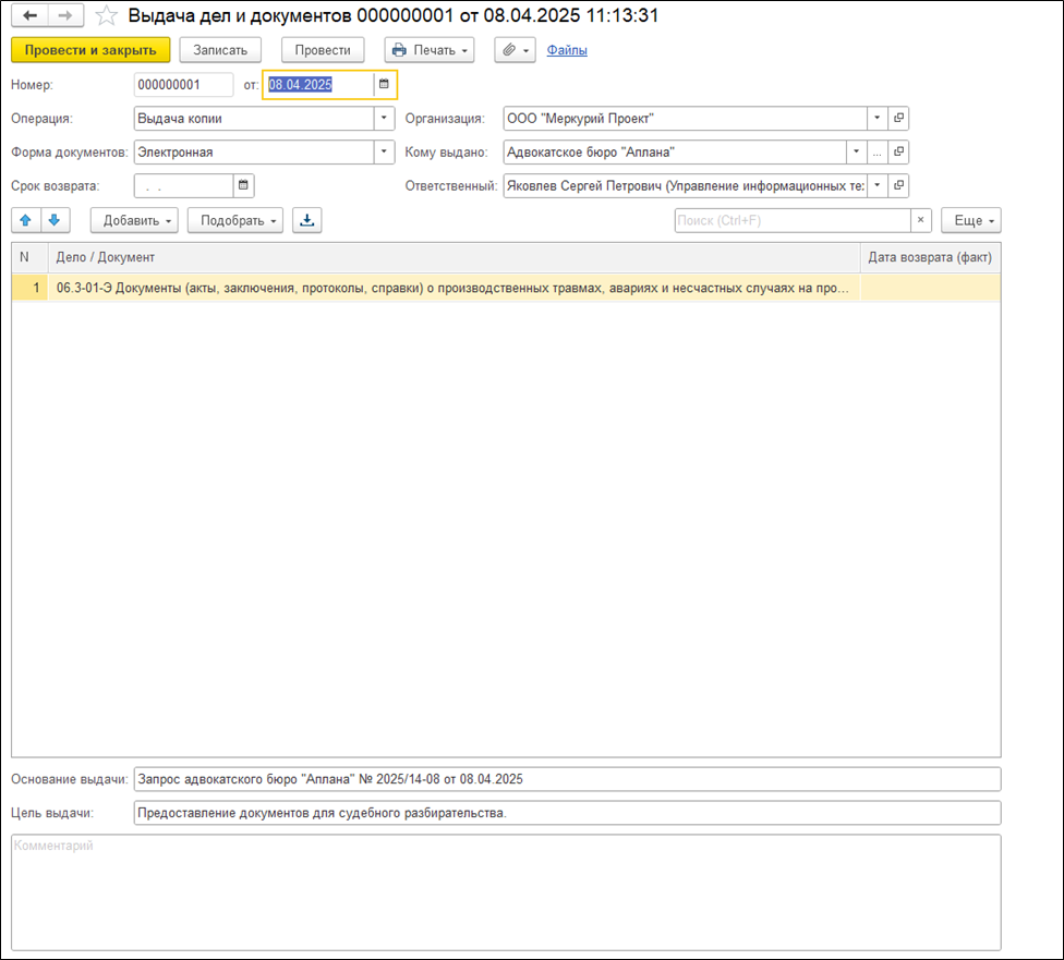 Процесс выдачи оформляется документом «Выдача дел и документов», который позволяет: