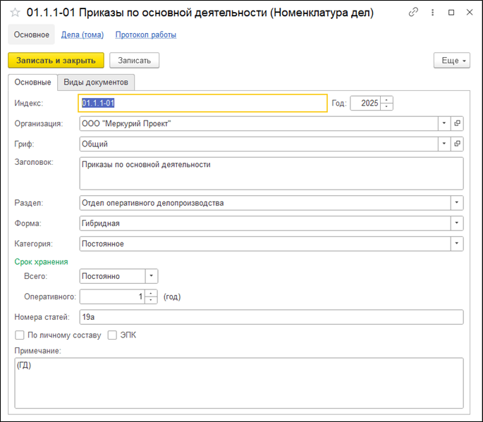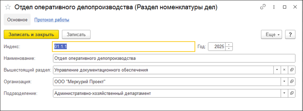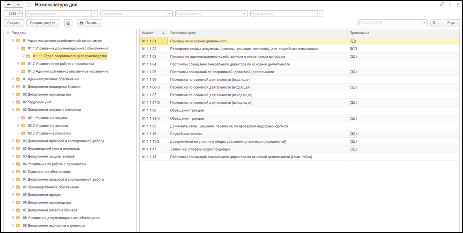 Номенклатура дел – систематизированный перечень заголовков дел, заводимых в организации в делопроизводственном году, с указанием сроков их хранения, оформленный в установленном порядке. В «1С:Архив для Беларуси» номенклатура дел: